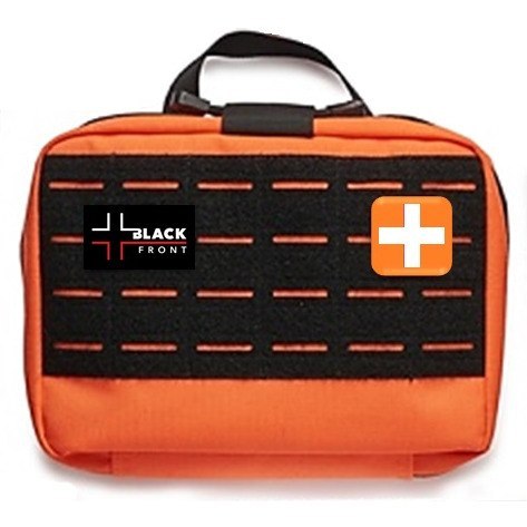 * produkt jest wyposażony w niełamliwe zamki błyskawiczne firmy YKK i solidne oraz trwałe klamry marki Nexus - wyposażenie apteczki: - rękawiczki diagnostyczne, nitrylowe - 10 sztuk - opatrunek z wkładem chłonnym 5 x 7,2 cm - 4 sztuki - opatrunek z wkładem chłonnym 10 x 10 cm - 2 sztuki - maseczka do RKO z filtrem - 1 sztuka (RKO - resuscytacja krążeniowo-oddechowa, to działania podejmowane u osób, które doznały nagłego zatrzymania krążenia - dzięki nim jest możliwe utrzymanie przepływu krwi przez narządy wewnętrzne szczególnie serce i mózg, tym samym zmniejsza się ryzyko wystąpienia zgonu) - siatka opatrunkowa nr 3, długość 1 m - 1 sztuka - siatka opatrunkowa nr 6, długość 1 m - 1 sztuka - paski do zamykania ran 3 x 75 mm (opakowanie 5 sztuk) - 1 sztuka - paski do zamykania ran 12 x 100 mm (opakowanie 6 sztuk) - 1 sztuka - chusta trójkątna włókninowa - 2 sztuki - nożyczki ratownicze Black Front PRO - 1 sztuka (nożyczki ratownicze Black Front PRO to narzędzie dedykowane dla najbardziej wymagających użytkowników - wykonane z bardzo wytrzymałego stopu stali węglowej, który dodatkowo został pokryty warstwą teflonową gwarantującą trwałość i solidność produktu (stal węglowa (tzw. stal niestopowa) to materiał bardzo szeroko stosowany, powstały z połączenia żelaza oraz węgla - wykorzystywana jest zarówno w popularnych przedmiotach codziennego użytku, jak i monumentalnych konstrukcjach czy skomplikowanych elementach mechaniki precyzyjnej - jest z reguły łatwa do obróbki, a przy tym, podczas typowych dla danego rodzaju zastosowań, niezawodna i niskokosztowa - stosowana jest do produkcji np. wierteł, ostrzy, tarczy - dodatkowym wymaganiem dla tej stali jest zazwyczaj tzw. płytkie hartowanie, sprawia ono, że powierzchnia narzędzia pozostaje bardzo trwała, natomiast wnętrze świetnie znosi uderzenia i nie kruszy się) - przydatne przy cięciu opatrunków, ubrań tkaninowych, pasów bezpieczeństwa czy innych bardziej wymagających materiałów) - opaska elastyczna 12 cm x 4 m - 3 sztuki - opaska dziana 10 cm x 4 m - 2 sztuki - gaza opatrunkowa jałowa 1 m2 - 2 sztuki - kompresy gazowe jałowe 10 x 10 cm - 4 sztuki - koc ratunkowy NRC - 4 sztuki (koc ratunkowy NRC inaczej folia izotermiczna, folia życia, folia NRC, koc termiczny, koc przeciwwstrząsowy - cienka płachta z metalizowanego tworzywa sztucznego - używana w ratownictwie, turystyce i wspinaczce oraz w sytuacjach awaryjnych w celu poprawy komfortu cieplnego - jej użycie opóźnia proces wychłodzenia organizmu, bowiem zmniejsza utratę ciepła organizmu w wyniku parowania wody oraz wiatru) - sztuczne światło LIGHT STICK - 1 sztuka - opaska uciskowa, staza taktyczna Black Front - 1 sztuka (opaska zaciskowa, staza taktyczna służy do zabezpieczenia kończyn na wypadek amputacji urazowych lub silnych krwawień tętniczych) - marker permanentny - 1 sztuka - wybijak do szyb z nożem do cięcia pasów - 1 sztuka - gumki (troki) mocujące szybkiego montażu - 2 sztuki