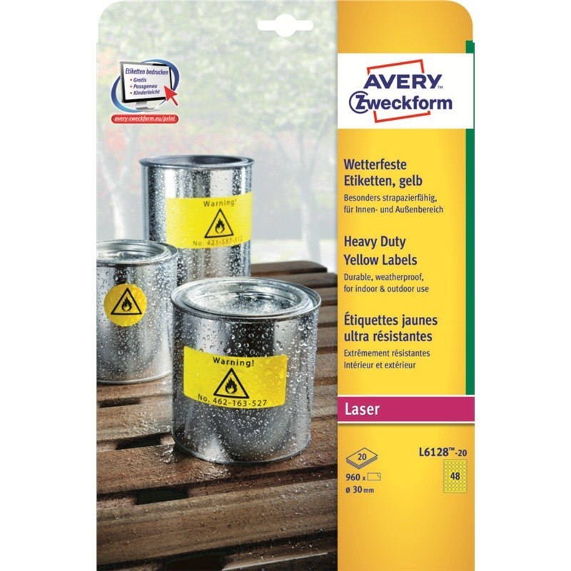 • ETYKIETY A4 AVERY HEAVY DUTY śr. 30mm ŻÓŁTE (20)