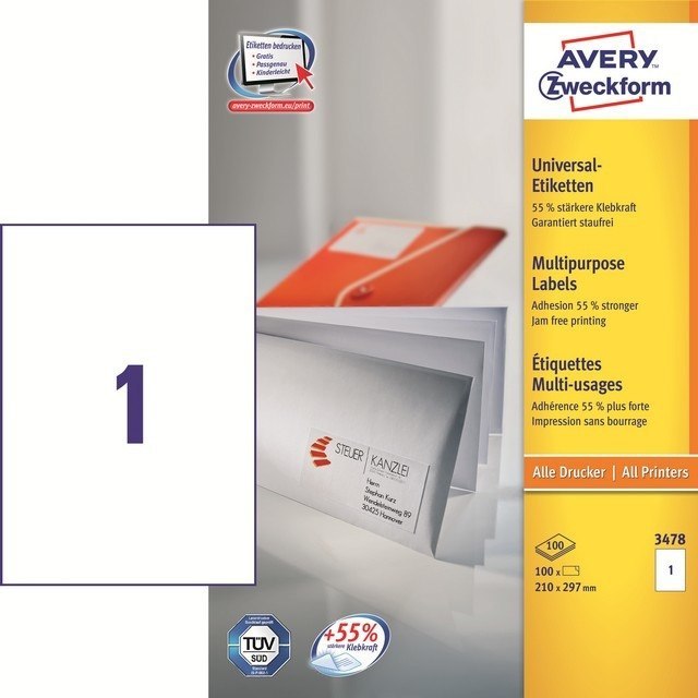 ETYKIETY A4 AVERY 210*297mm BIAŁE (100)