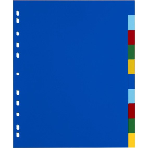 * Kolorowe przekładki w powiększonym formacie A4+, wykonane z wytrzymałego polipropylenu odpornego na zniszczenie - doskonałe do organizowania dokumentów w segregatorze. Komplet zawiera 10 przekładek z niezadrukowanymi indeksami. Na pierwszej karcie umieszczono specjalne miejsca do opisu zawartości.