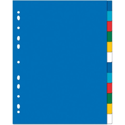 * Kolorowe przekładki w powiększonym formacie A4+, wykonane z wytrzymałego polipropylenu odpornego na zniszczenie - doskonałe do organizowania dokumentów w segregatorze. Komplet zawiera 12 przekładek z niezadrukowanymi indeksami. Na pierwszej karcie umieszczono specjalne miejsca do opisu zawartości.