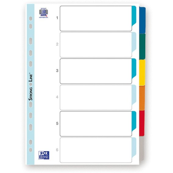 * Przekładki wykonane z grubego, białego kartonu Mylar - doskonałe do organizowania dokumentów w segregatorze. Komplet zawiera 6 przekładek z niezadrukowanymi, kolorowymi indeksami. Na pierwszej karcie umieszczono specjalne miejsca do opisu zawartości.